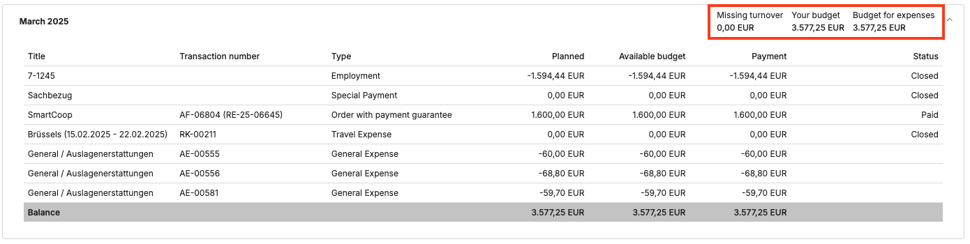 Your budget: this is the available budget for your employment and travel expenses in the respective month. This budget is based on your orders with a payment guarantee or on orders that have already been paid.