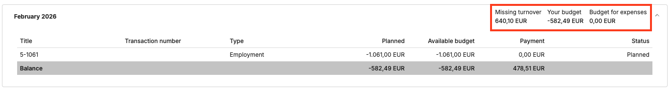 - Budget for expenses: Available budget for expenses and budget transfers. It is based on the payments actually received and assumes that your employment costs are covered in the respective month.